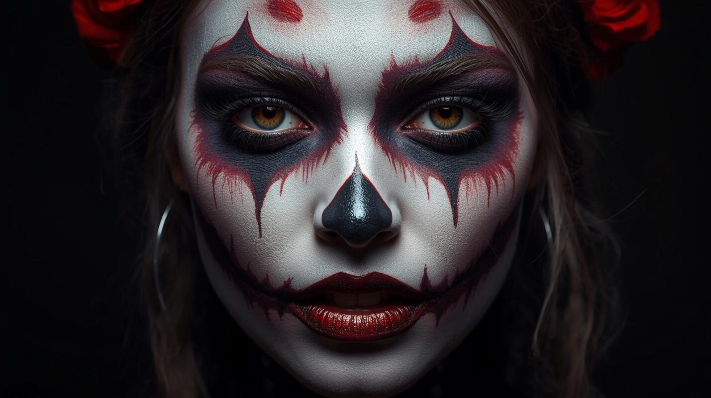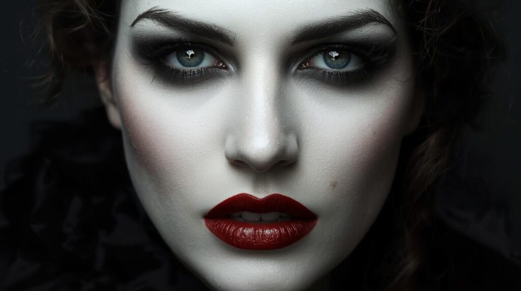 ハロウィン定番の“吸血鬼風メイク”は、赤と黒のコントラストで一気に雰囲気が出ます。