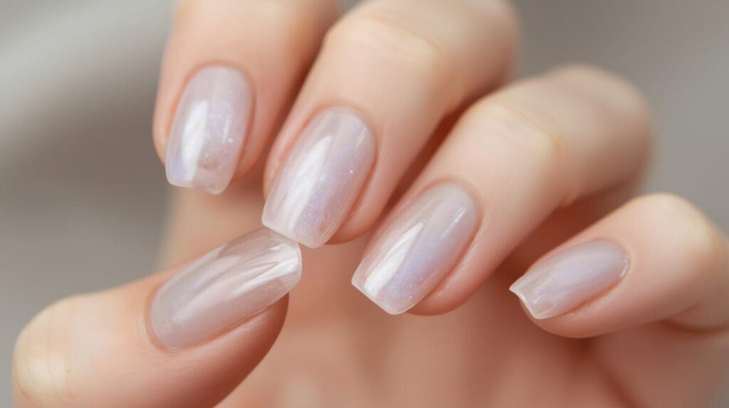 ・透け感のあるシアーグレージュが指を細くきれいに見せる